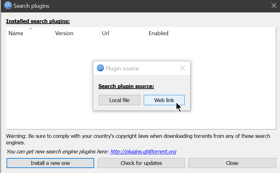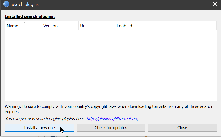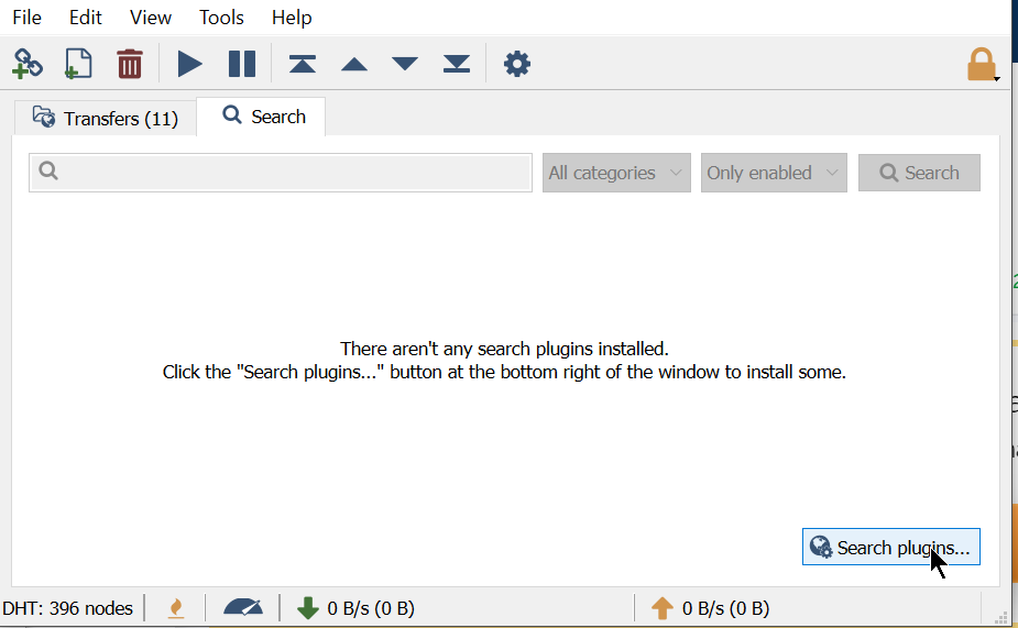 Navigate to the Search tab, and you'll see a message saying There aren't any search plugins installed. Before we can search torrents, we'll need to add in some sources for the client to look for.