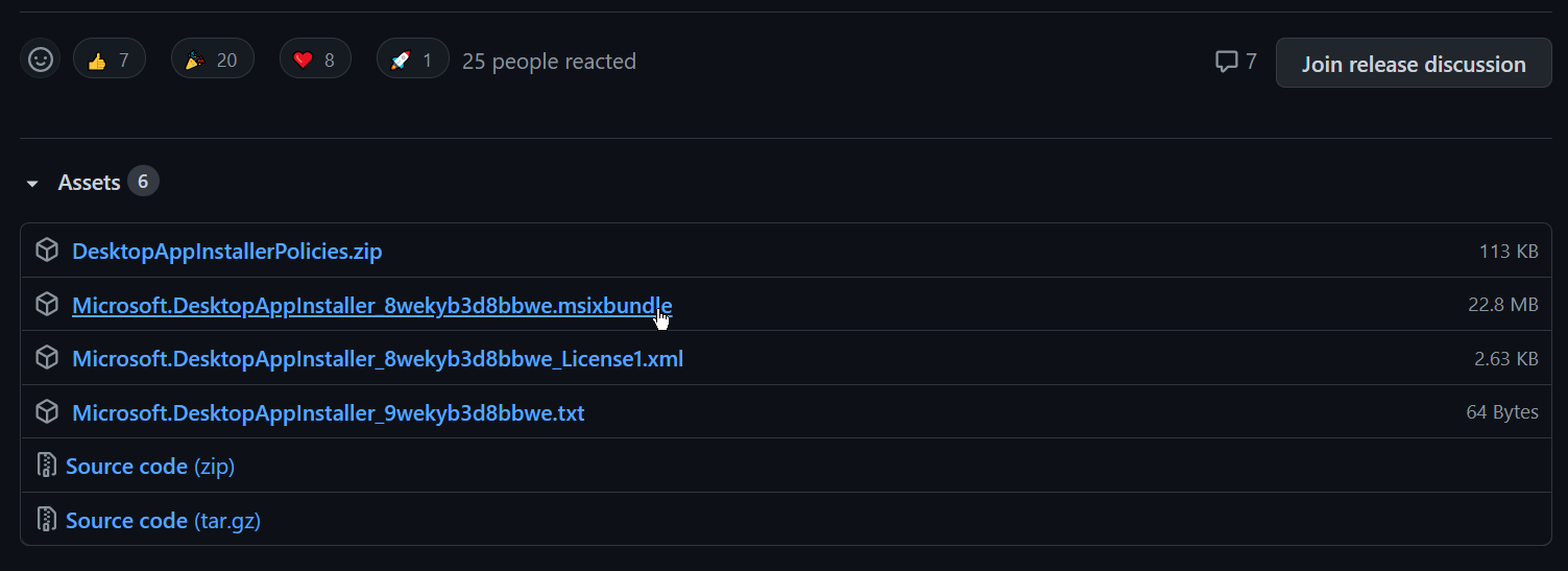Next, we will install winget. Navigate to microsoft/winget-cli/releases, find the dropdown for "Assets", and select the ~20MB download link for the file ending in .msixbundle: