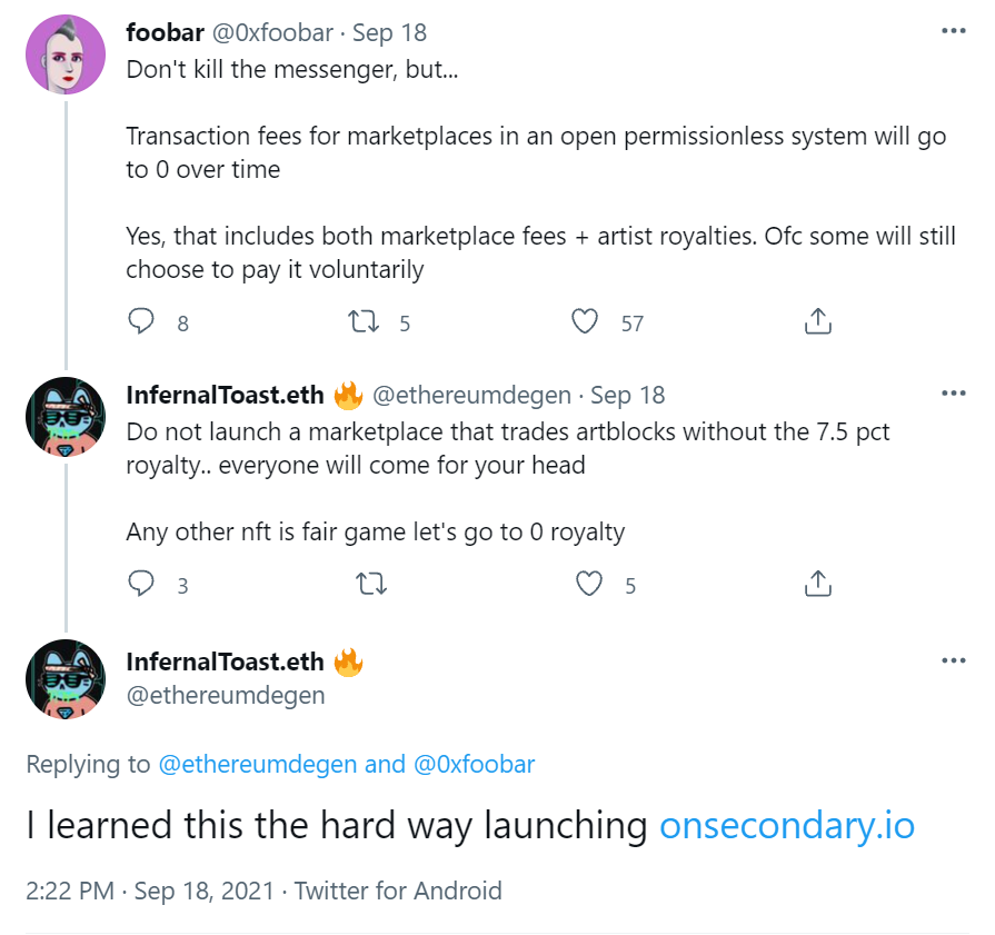In the discussion that took place, some argued for a half fee royalty to the artists as a compromise, but this still misunderstands how decentralization works: it could and will easily be forked to remove the fee to maximize consumer benefit. If you don't build it, someone else will; and if you set high fees, someone else will lower them. This is the nature of open source code, and it's healthy market competition. You can't stop the free flow of technology, only build new solutions around it. The only reason the existing platforms have survived until now is because they hide their codebase, forcing developers to rebuild them from scratch.