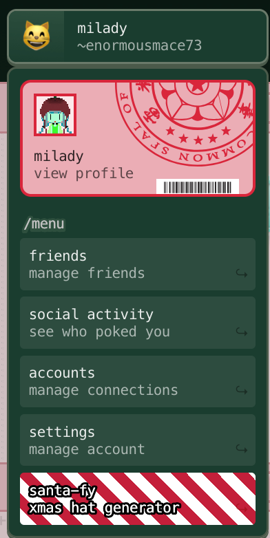 The Santa-fy Xmas Hat Generator is available any time under the profile menu in the top right corner of the site, simply click on your name and note the cheerful candy cane stripe button begging and pleading to be clicked.