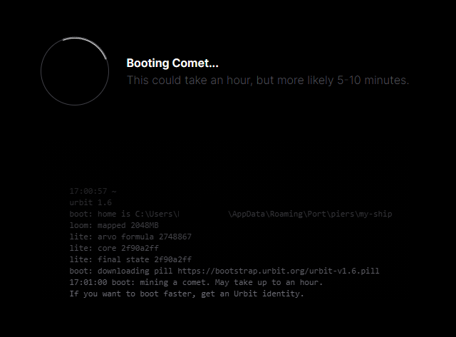 If it takes longer than 30 minutes or throws an error, cancel or hit the home button on the bottom left and try boot > comet to start the process over.Once it's completed, you'll be greeted with this screen. Hit Launch Ship into Urbit to continue.