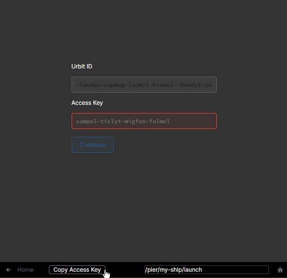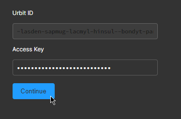 You'll see a screen like this. In Urbit ID will be your randomly generated username. You'll need your Access Key to continue, essentially your generated password.