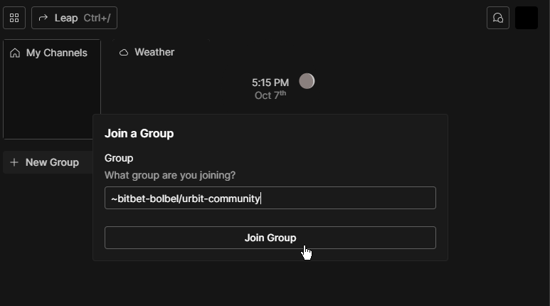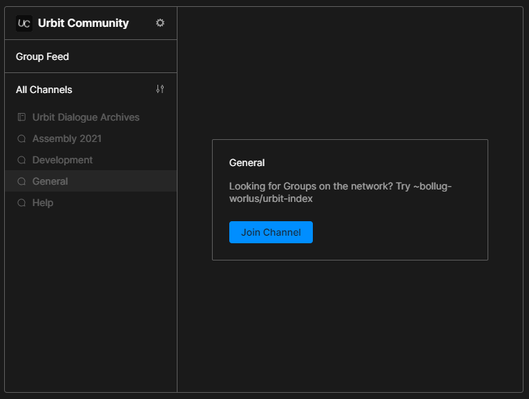 Note - when you join a group, you will need to individually select which of its channels you want to join into. For example, in Urbit Community you'll want to click General on the sidebar then Join Channel.
